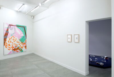 Attracted by their colorful lightness and their engaging rhythm, one approaches these works with confidence. They look willing and ready for consumption. Once you start looking for an entrance, however, confusion sets in very quickly. Not finding an easy access, one tries to hold on to whatever looks familiar. One seems to recognize representations of known domestic objects and motifs, but their forms quickly dissolve and slip through one’s fingers like sand, and so one looks harder. The same goes for the painterly gestures: some of the gestures look familiar while others recall well-known modernist movements. These gestures, in which the liberating alliance between body and matter was inscribed, come back in Rebekka’s works as echoes and images. The paintings are filled with things that are going either towards or away from representation; things that are not yet or are no longer named. Although they look finished and finalized; everything in the paintings is fluid and in a state of becoming. There is no reassuring division between figure and background. There is no clearly framed window and thereby not one perspective. The paintings have more than one focal point and destabilize a two-dimensional understanding of space. The space that these paintings show can only be seen if one is willing to give up control and be moved. In trying to see what happens in the painting, you have to leave your point of view, lay down your grasping gaze, and make your sight a physical and mobile experience. Much as in Hans Holbein’s Ambassadors, you can never see the whole picture at once, which brings in notions of time and travel. Only after giving up a functional perception and the will to communicate and consume can you find access to these works. Your eyes have to drift and wander.