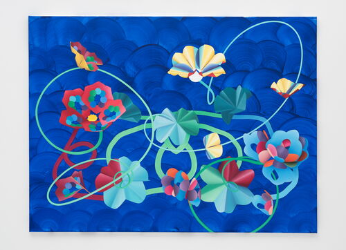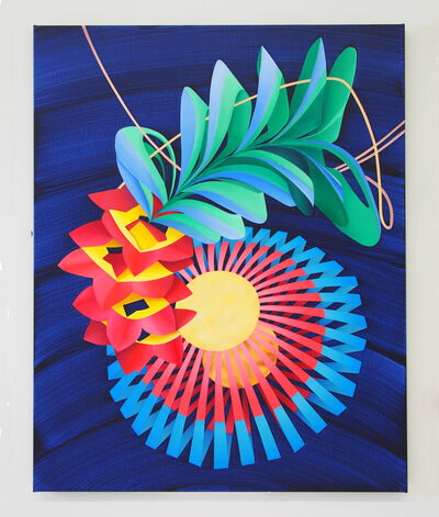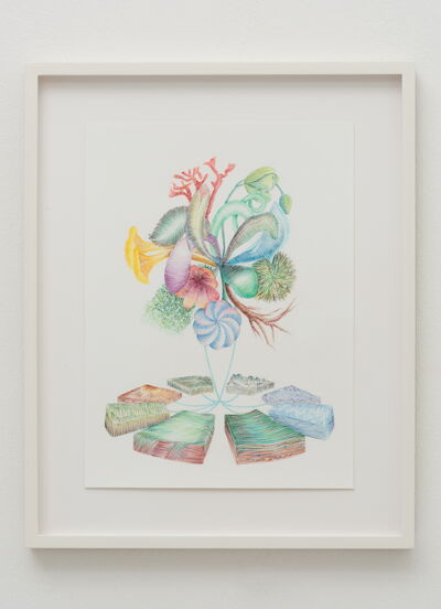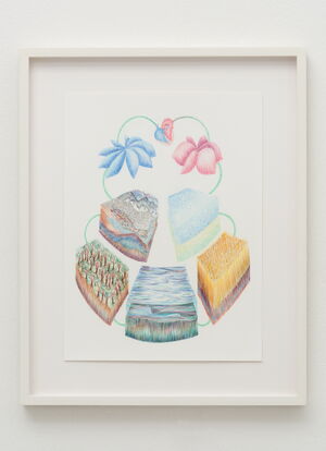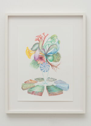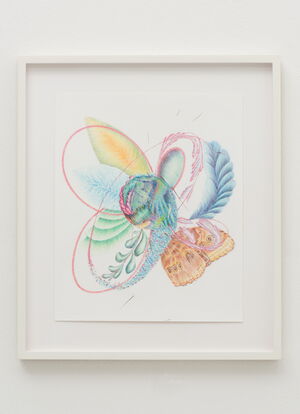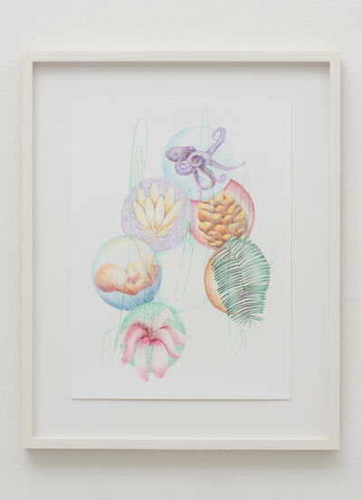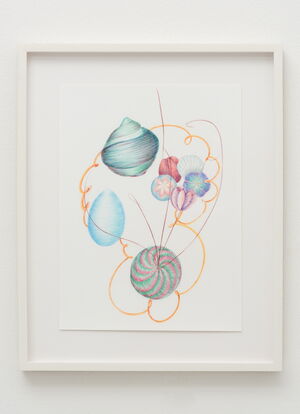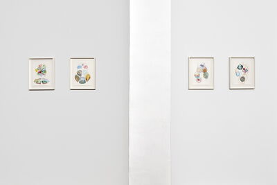 The single elements are a build-up of several leaf-like forms, which are mostly arranged around a centre, an origin. In some of the paintings, they get linked by different line patterns, which can be seen as diverse circuits or interconnections that link living beings to all life on earth. The works also address growth, movement, and reproduction as specific characteristics of life. These are particularly represented through the recombination, repetition, and linking of different elements.