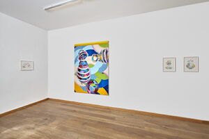 The paintings do not depict any technical detail. However, some pictorial elements are inspired by forms and components of technical devices or drawings and others by transmission paths via wires, cables, or measurement diagrams that show waves or radiation or the like. Other elements should remind one of simplified or universal characters of handwriting or phonetic symbols.